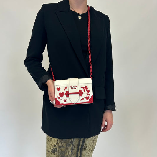 Prada Bianco and Fuoco City Calf and Saffiano Flower and Heart Studded Cahier